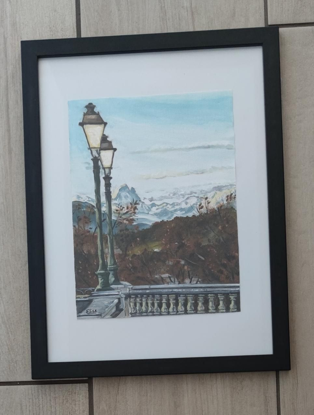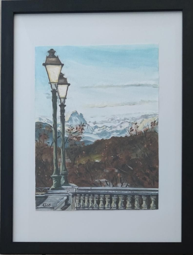 Peinture acrylique sur toile feuille représentant le boulevard des Pyrénées à Pau avec la vue sur le Pic du midi d'Ossau.