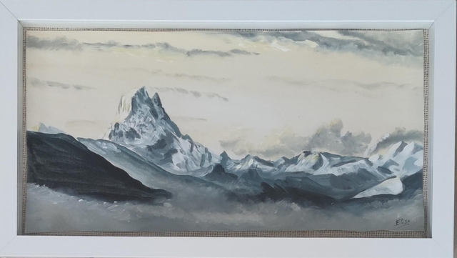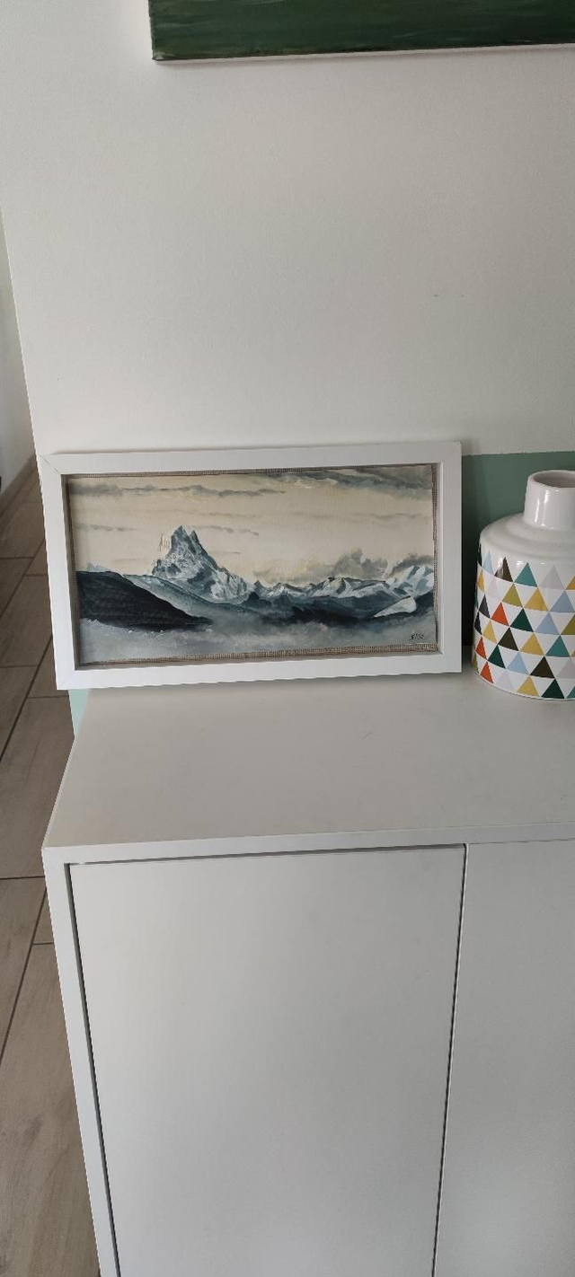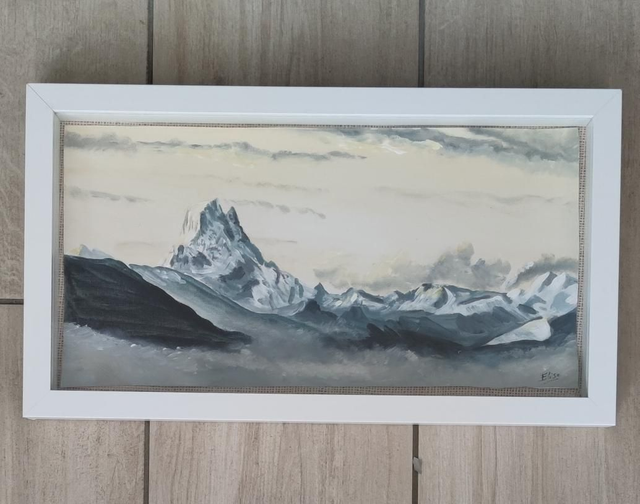 Peinture acrylique sur toile feuille représentant les Pyrénées au lever du jour