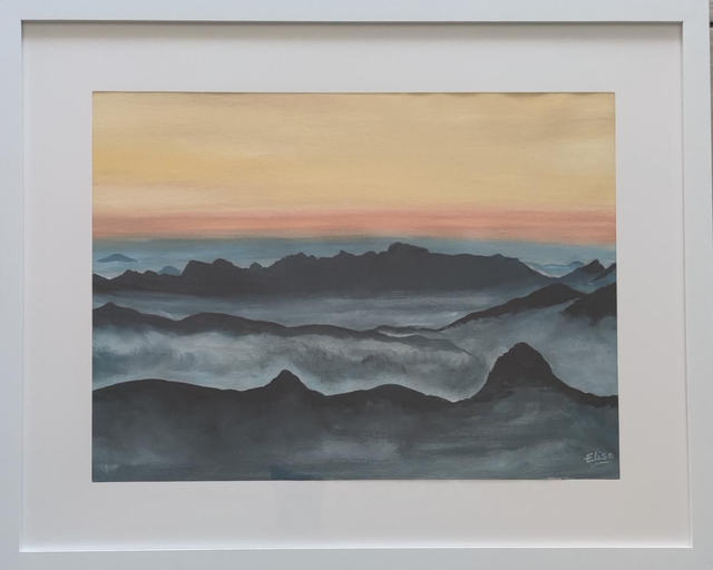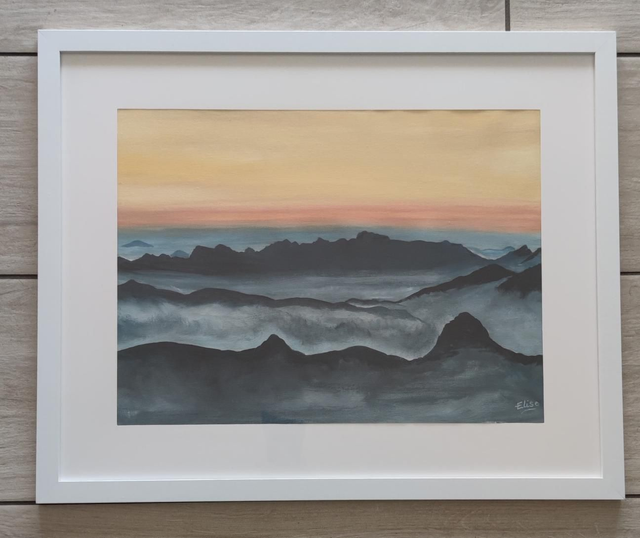 Peinture acrylique sur toile feuille format A3 représentant la chaîne des Pyrénées au lever du soleil depuis le Pic du midi de Bigorre.