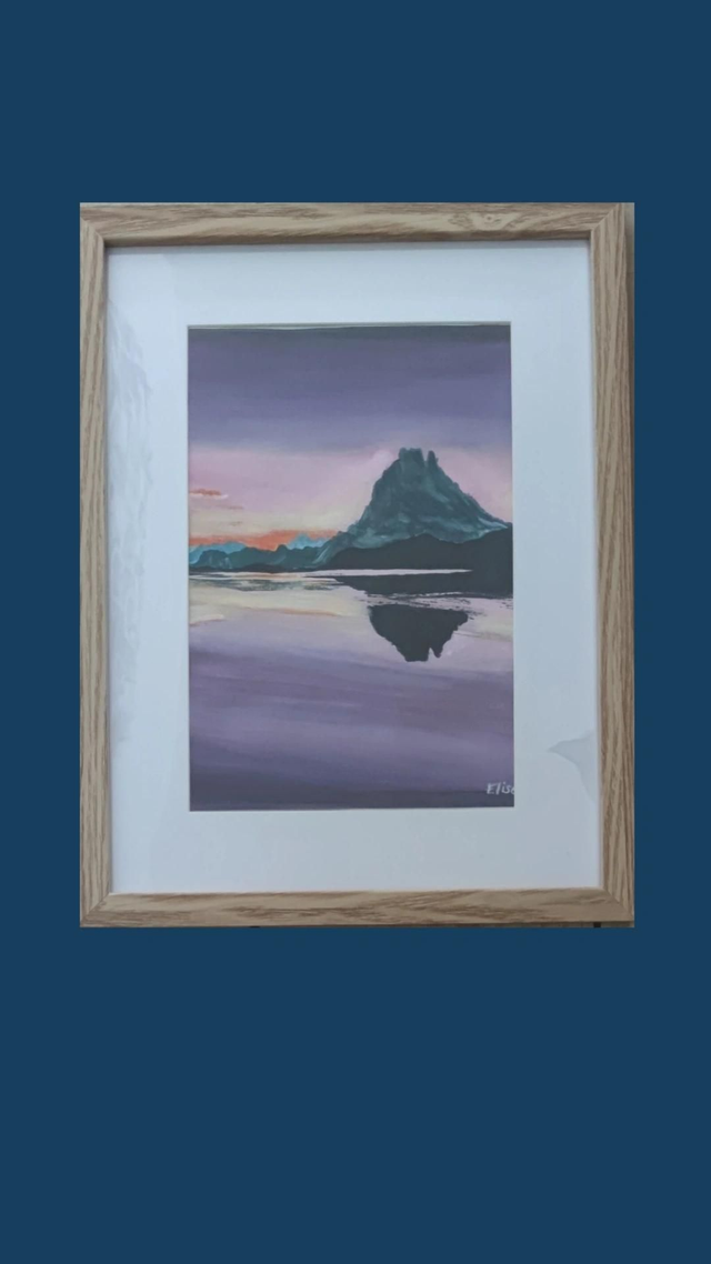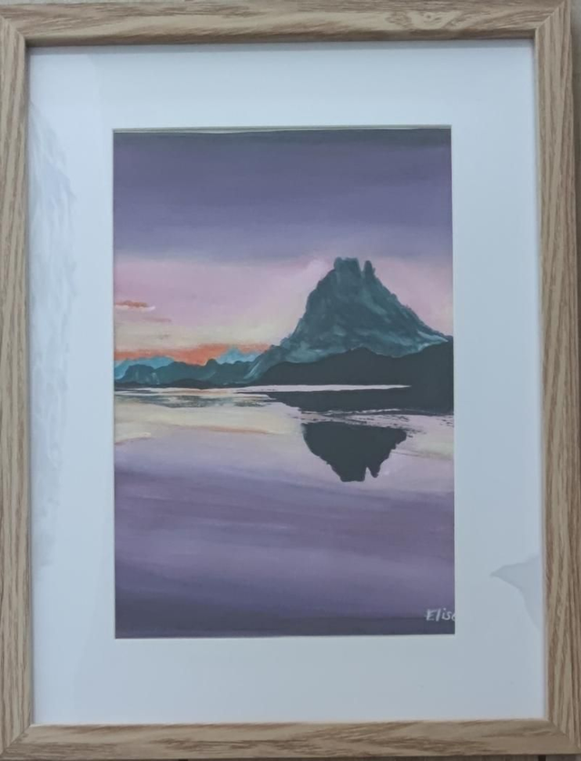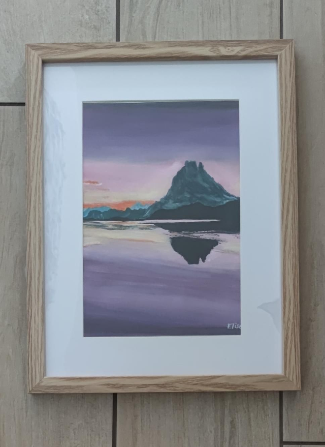 Peinture acrylique sur toile feuille format A4 encadrée représentant le Pic du midi d'Ossau dans une ambiance violette .